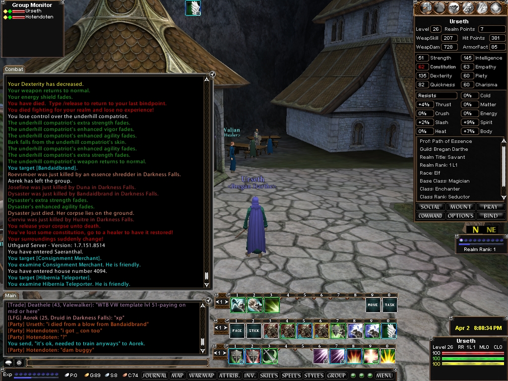 Urseth - Enchanter Lv 39 S/C 308 Jandur - Mentalist Lv 13 Evilstar - Ranger Lv 35 FLetcher 552 Githyanki - Nightshade Lv 20 Alc Treeofwoe - Animist Lv 10 Deathblow - Guardian Lv 10 |