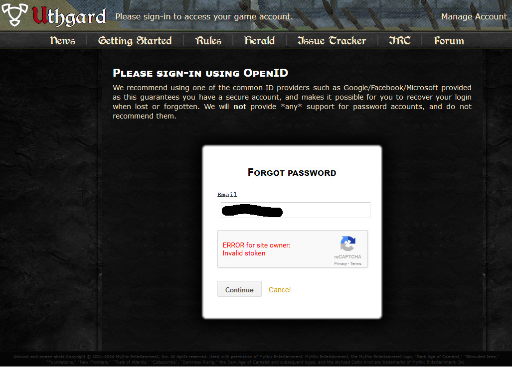 Btw. same error when you need more than a few retries for your password and the captchas are coming. Not gonna make a screenshot that one as well, as it is the same, just with "sign in" as title and another button name... Since tokens are often domain name bound, I made sure visiting the "default" name, aka. the one you get relayed to, in case you try something else like actually using a server name (www.uthgard.org) or the other domain (uthgard.net), but all relay to https://uthgard.org/ (or end up in 404) as the only option to access the login. Also the error occurs both in Mozilla and Edge as browser, obviously whether I need to enter a captcha is IP and not session based. PS: Lucky for anyone waiting in the queue, I am out for the night! But now imagine how long the queue was, if everyone was able to login... |
