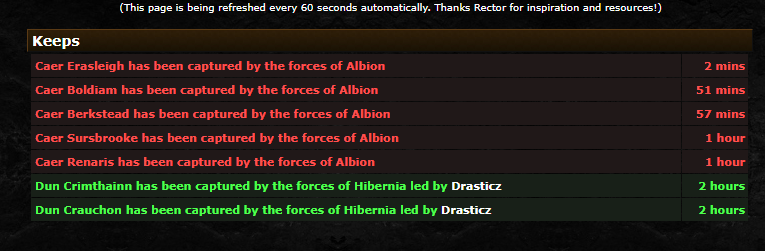 Since 75 minutes ago, in the time span of about 30 minutes, 4 keeps in the Alb frontier have been taken by the forces of Albion, including 2 keeps (Berk and Surs) in just 3 minutes, BUT: Albion didn't have anyone in the frontier zones, not even anons (/who all and /who displayed the same numbers and nobody was in Forest Sauvage or Pennine Mountains). So I wanted to see who was taking our keeps and what did I see? I arrived at Boldiam just in time to witness a purple Man at Arms (a border keep guard of Albion, iirc) running around Boldiam and occasionally hitting Maglan https://daoc.scheffel.it/char/Maglan. A few moments later Caer Boldiam was taken by "The Forces of Albion", but I am absolutely certain that I was the only Alb nearby at the time, with at least the outer door of Boldiam being closed. And as a reminder: There were not enough Albs online in that zone, not even anon, to take that keep. So what I believe: Maglan pulled border keep guards from either Snowdonia Keep or Forest Sauvage Keep through the Alb frontier, pulled it close enough to the Hibernian (!) Keep Lord and waited until the very strong guard killed a keep lord of HIS OWN REALM. Why he did that? There are many possible reasons: 1. Hibs didn't have any more Alb keeps to take and maybe don't want to take Mid keeps, so by (ab)using this tactic, they have more keeps to take this night. 2. Hibs don't want to give Albs the possibility to reraid our own keeps for RPs 3. He may be an If it's 1., I am very certain that this violates rule 6 and also kinda 8 of the "Access to the game server and in game behaviour": Rule 6. "Abuse of bugs, exploits and obvious game errors is forbidden. If you are not sure whether something is a bug or an error then please ask the Uthgard staff for help and clarification. Bugs have to be reported." Rule 8. "Intentional cooperation of players between different realms is not allowed. This includes arranged duels and realm point farming." The game designers and also the devs of Uthgard never designed the keep take mechanics in a way that a realm can give up their own keep and give it back to the original owner of said keep, so this is obviously an exploit and if you use it to retake the keep later (actually any time later, as long as the Mids didn't take it in the meantime) for RP gain, you actually farmed RPs. Oh, it started again..., now Eras was taken... Shenyen