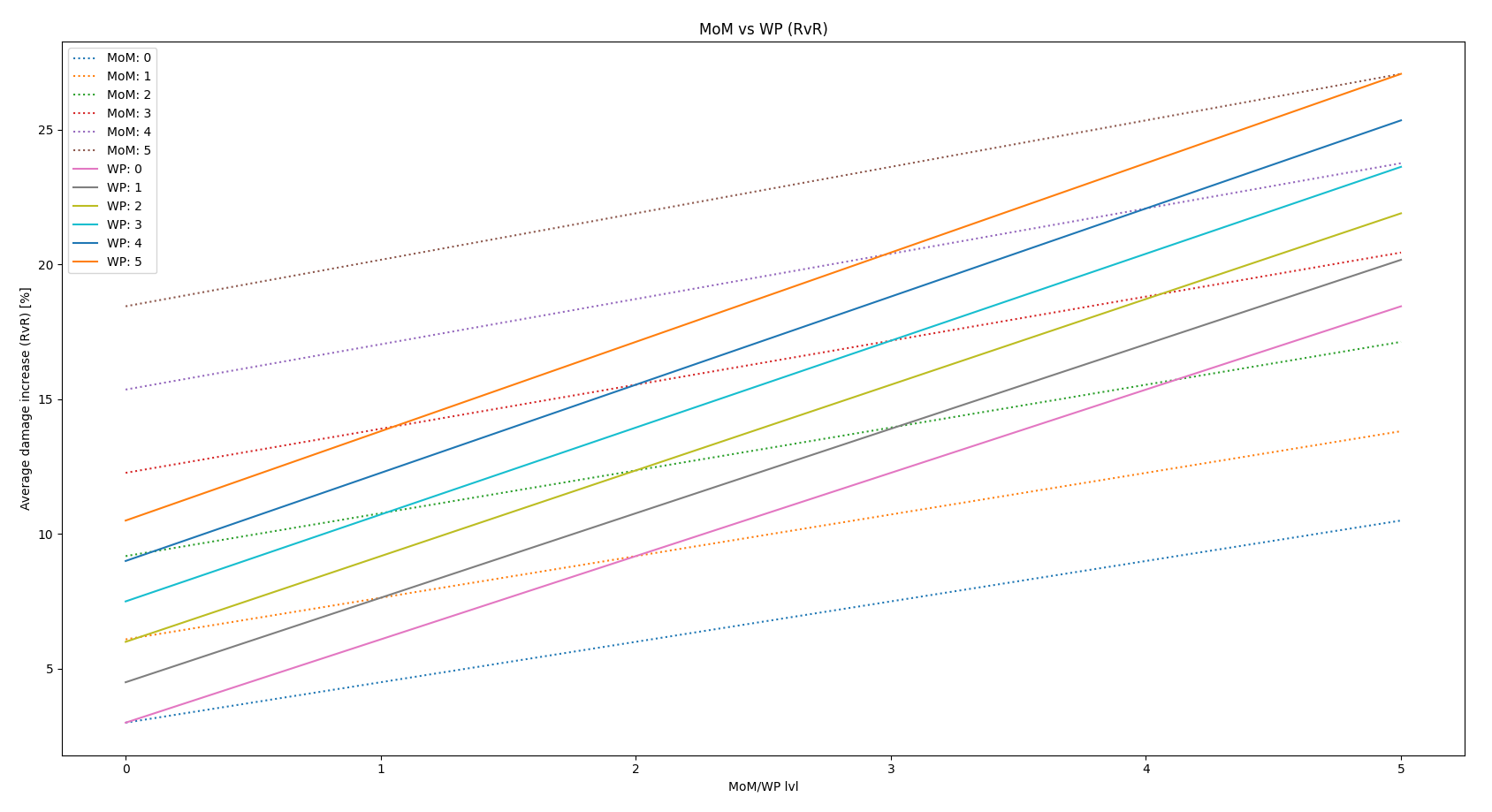 We got our confirmation - it is clear that the damage rises quicker towards the 'right' (increasing MoM level) than it does towards the 'left' (WP) and the difference is more pronounced in RvR (as we have already seen).