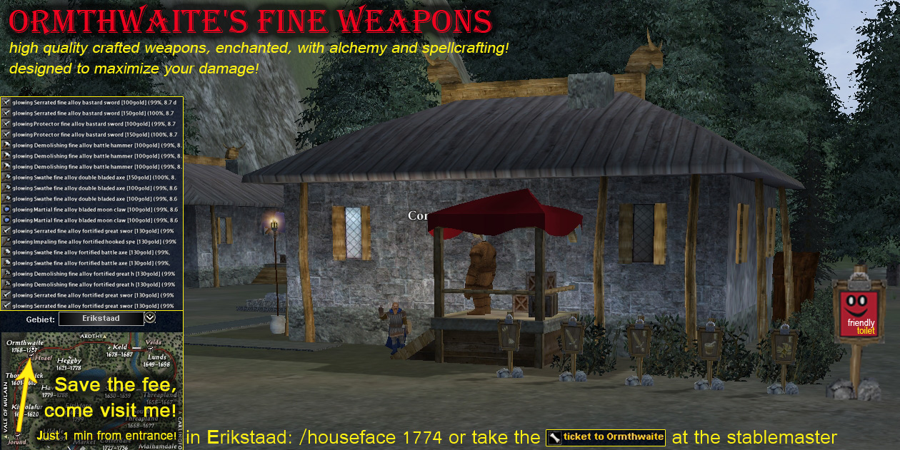 Recently, a new shop opened not far away from the housing entrance and with direct horse-connection! This shops main focus is to offer you high quality weapons that are designed to maximize your damage and give you some comfort on the exhausting way while leveling your Uthgard char. You'll find a broad range of one and two-handed weapons, staves and shields. All weapons are enchanted, have an alchy proc applied and are imbued with useful skills and stats by spellcrafting! You can come to the merchant by buying a "ticket to Ormthwaite" from the stable master at the housing entrance. Feel free to /bind and use NPCs or the toilet outhouse, but please leave it as you would like to find it! -click the pic to enlarge- Just one example: Lvl26 weapon with lvl 20 proc and useful stats At the moment there are all weapons suitable for lvl 20+, including focus staves. Higher levels will come later when I've ripped you off... ehrm when the amount of sales allow me to invest in more expensive materials. If you want to hire me for crafting orders, see this thread: [Mid] Crafter offering service Hoping to see you all buy my weapons, Rector |