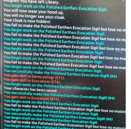 As visible from the picture it is gem 564, at that moment gemcutting is 553 and evocation is a bit hgher. This is from spellcrafting and as all people do i craft orange and not far from my level. But even when they become yellow is still the same... till 500 was ok from 500 to 560 took me 2 days with many fails. In tailoring blue items that take long to craft with many fails I repeat on blue items. So it's not about the level.